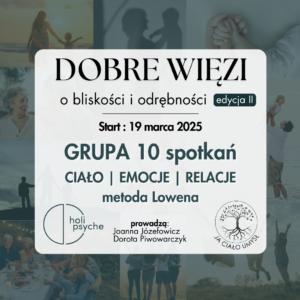 Zapraszamy Cię na 10 tygodniową grupę „Dobre więzi”. Będzie to pogłębiona praktyka metodą Lowena, w czasie której przyjrzymy się dogłębnie naszym schematom relacyjnym, dotkniemy źródła ich powstania, zrobimy miejsce na czucie i rozumienie. Spróbujemy zrobić kolejny krok ku zmianie, ku decyzji – „chcę inaczej traktować siebie, chcę inaczej wchodzić w relacje, chcę inaczej być traktowana/y”.