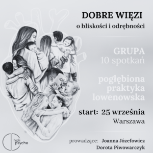 Zapraszamy Cię na 10 tygodniową grupę „Dobre więzi”. Będzie to pogłębiona praktyka metodą Lowena, w czasie której przyjrzymy się dogłębnie naszym schematom relacyjnym, dotkniemy źródła ich powstania, zrobimy miejsce na czucie i rozumienie. Spróbujemy zrobić kolejny krok ku zmianie, ku decyzji – „chcę inaczej traktować siebie, chcę inaczej wchodzić w relacje, chcę inaczej być traktowana/y”.