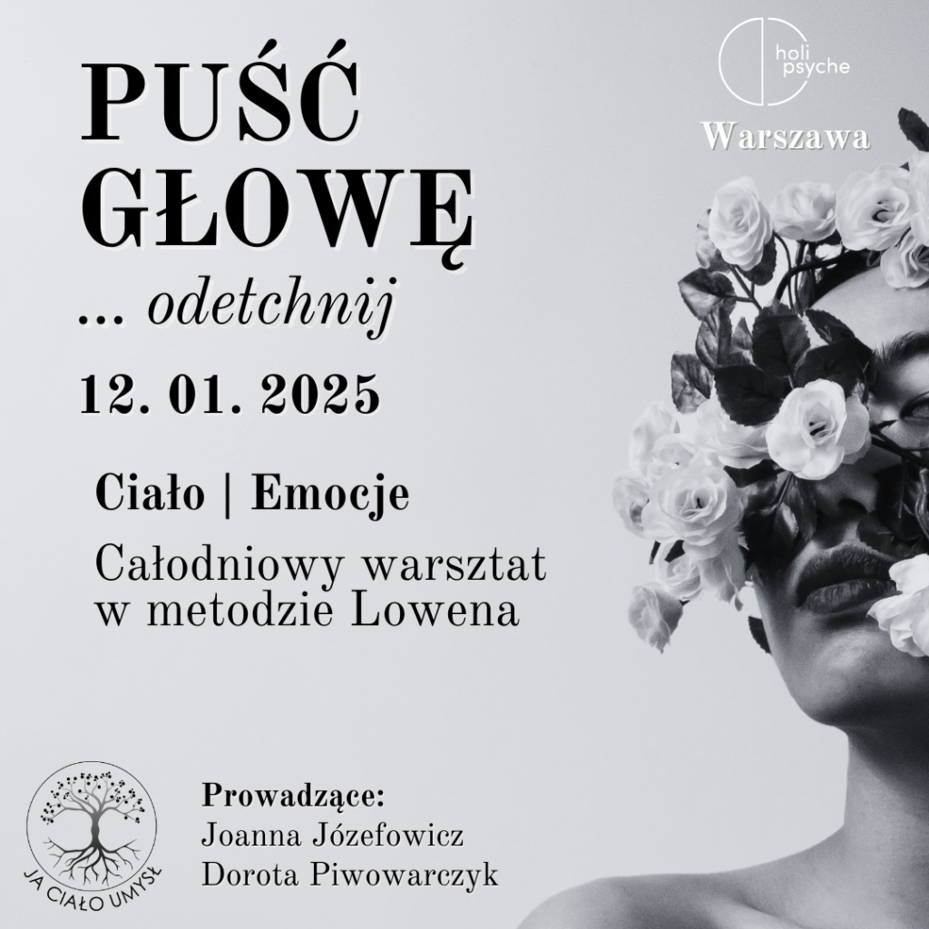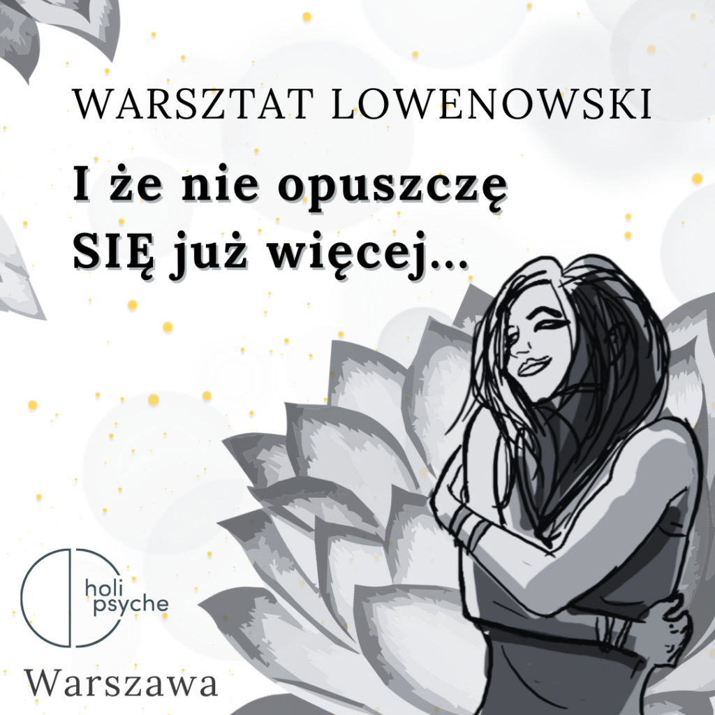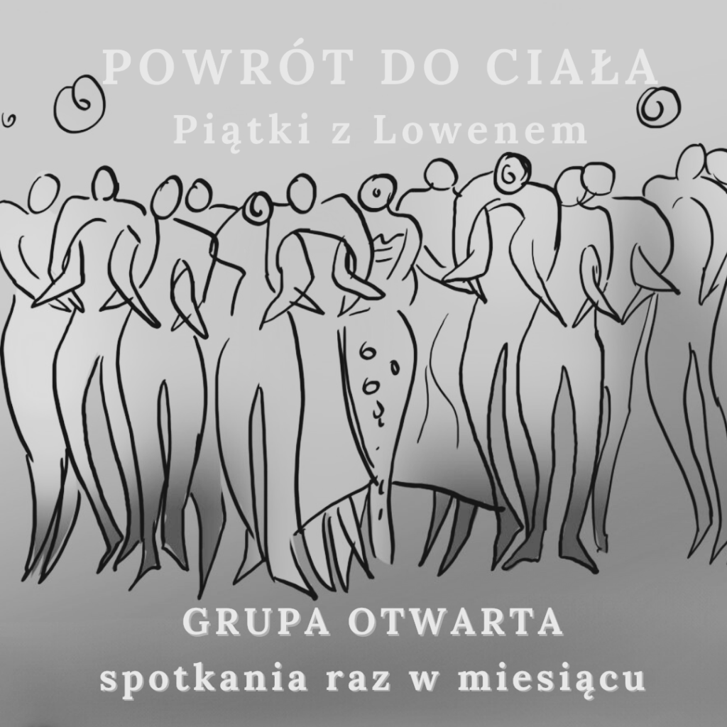 Dobre więzi – bliskość w odrębności. Pogłębiona praktyka lowenowska.„Powrót do Ciała. Piątki z Lowenem” – grupa otwarta, spotkania raz w miesiącuNie musisz wszystkiegoKocham, lubię, szanuję – o przyjmowaniu siebie w pełni (styczeń 2025)„PUŚĆ GŁOWĘ, odetchnij…”Dobre więzi – bliskość w odrębności. Pogłębiona praktyka lowenowskaWarsztat lowenowski, weekend 30.11-01.12OTWORZYĆ SERCEWarsztat pracy z ciałem dla par „W tandemie”123456