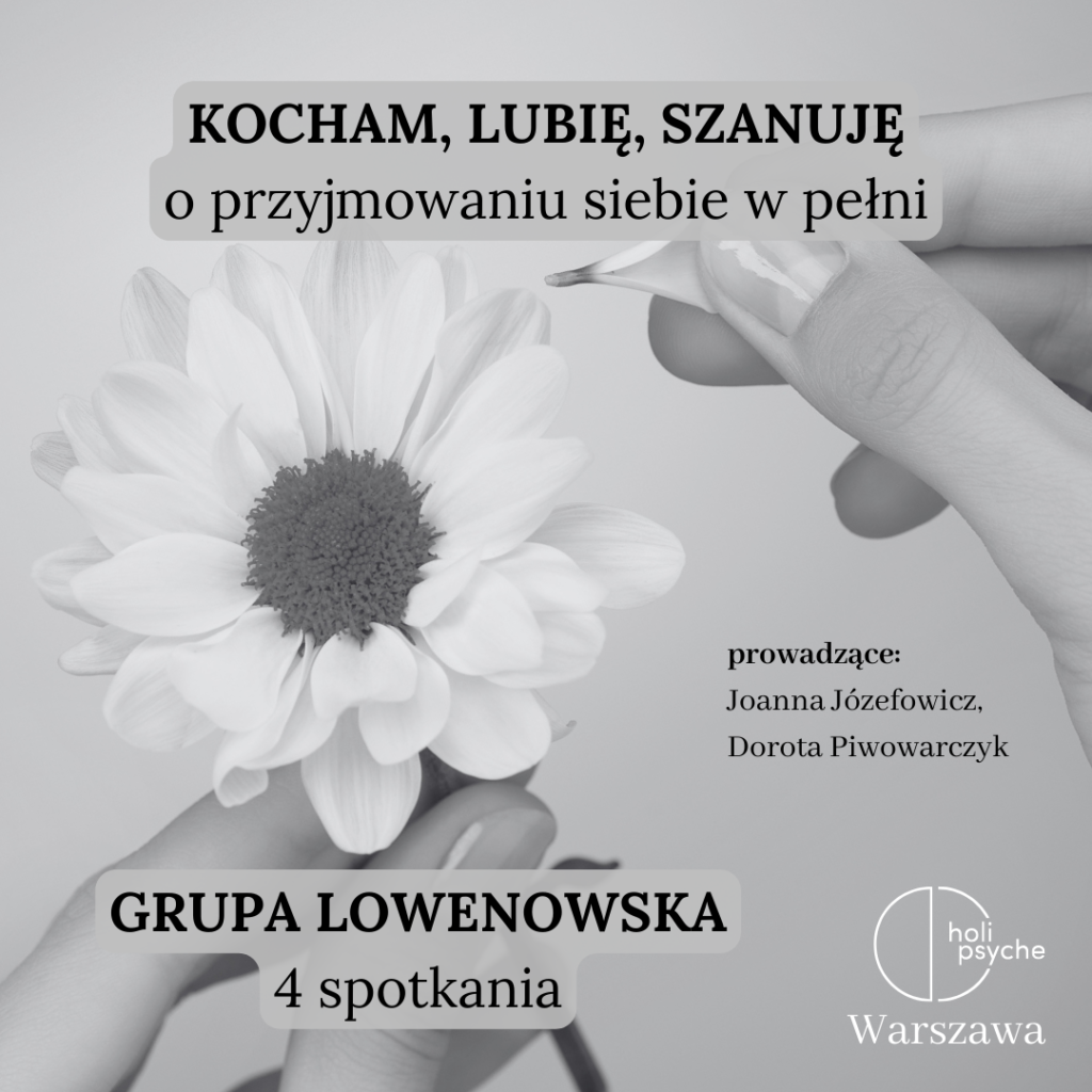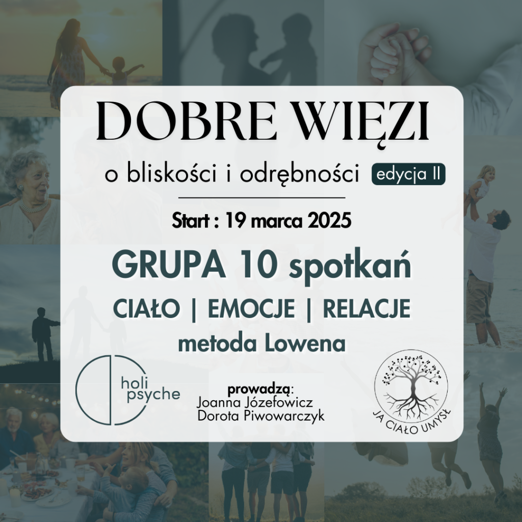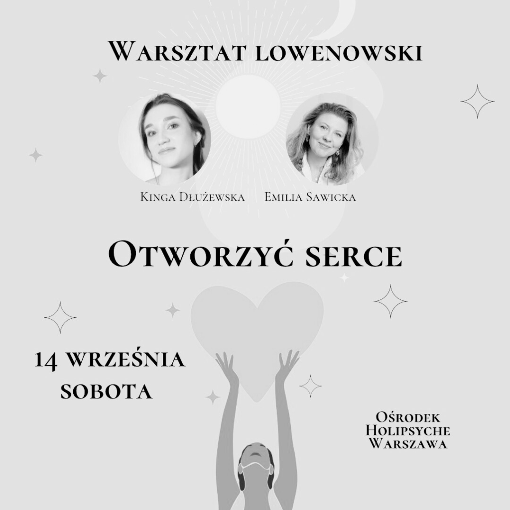Dobre więzi – bliskość w odrębności. Pogłębiona praktyka lowenowska.„Powrót do Ciała. Piątki z Lowenem” – grupa otwarta, spotkania raz w miesiącuNie musisz wszystkiegoKocham, lubię, szanuję – o przyjmowaniu siebie w pełni (styczeń 2025)„PUŚĆ GŁOWĘ, odetchnij…”Dobre więzi – bliskość w odrębności. Pogłębiona praktyka lowenowskaWarsztat lowenowski, weekend 30.11-01.12OTWORZYĆ SERCEWarsztat pracy z ciałem dla par „W tandemie”123456